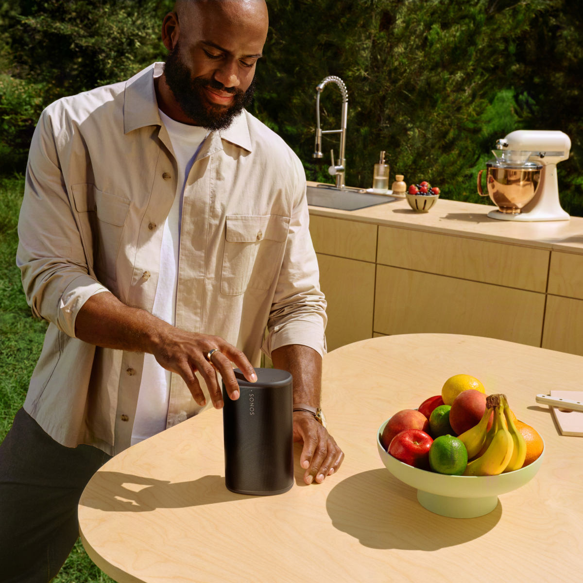 Use the button controls to play, pause, skip, replay, adjust the volume, mute your voice assistant, and group or ungroup Sonos products.